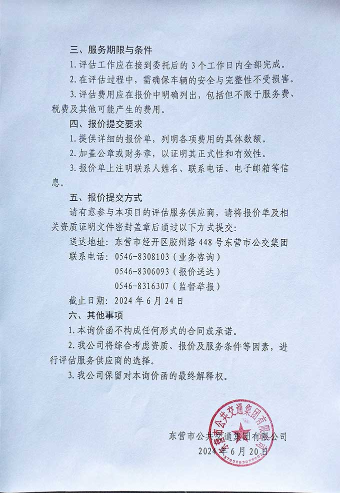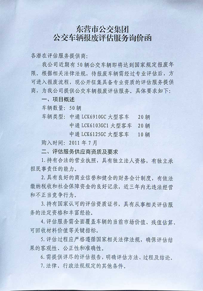 我公司近期有50輛公交車輛即將達到國家規(guī)定報廢年限。根據(jù)相關法律法規(guī),待報廢車輛需經(jīng)過專業(yè)評估后,方可進入報廢流程,現(xiàn)公開征集具備專業(yè)資質(zhì)的評估服務提供商,為我公司提供公交車輛報廢評估服務。具體要求如下: