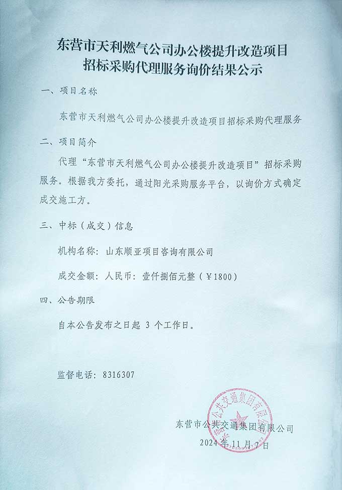 東營市天利燃氣公司辦公樓提升改造項目招標采購代理服務詢價結果公示