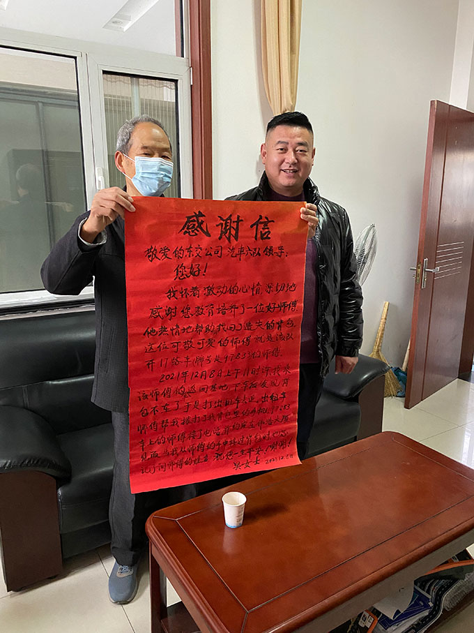12月9日上午,東營(yíng)市公交公司汽車六隊(duì)的辦公樓里來(lái)了兩位手捧大紅色感謝信的老人家。上面寫著“感謝您教育培養(yǎng)了一位好師傅,他熱情地幫助并找回了遺失的背包。”