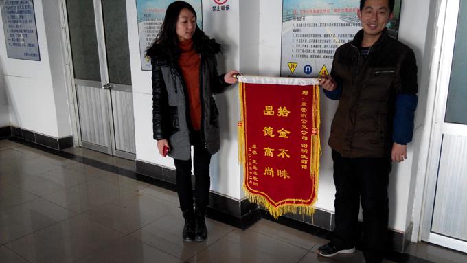 2014年1月23日,乘客王女士拿著一面寫有“拾金不昧,品德高尚”的錦旗來到市公交公司汽車一隊,感謝車隊謝明武師傅的高尚品德。