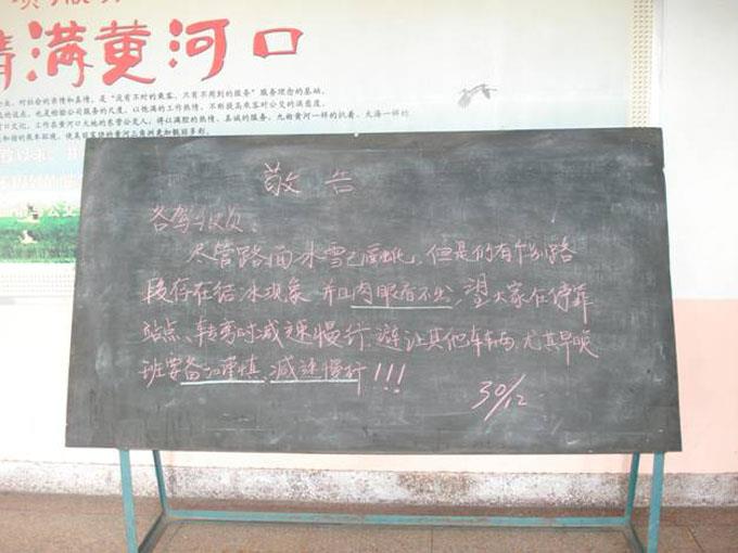 過(guò)去幾天的一場(chǎng)大雪,給車(chē)隊(duì)的安全生產(chǎn)帶來(lái)了很大的考驗(yàn),隨著路面上大部分積雪的融化,車(chē)輛已經(jīng)能夠基本正常運(yùn)行,但公交公司汽車(chē)三隊(duì)管理人員對(duì)安全工作絲毫不敢松懈,堅(jiān)持每天上路巡查車(chē)輛運(yùn)行情況和路面違章違紀(jì)情況,根據(jù)自身實(shí)際以敬告的形式將安全提示寫(xiě)到黑板上,擺放在大廳門(mén)口,給駕駛員一個(gè)提醒,同時(shí)重點(diǎn)做好鄉(xiāng)鎮(zhèn)線路和個(gè)別駕駛員的安全叮囑工作,確保行車(chē)安全。