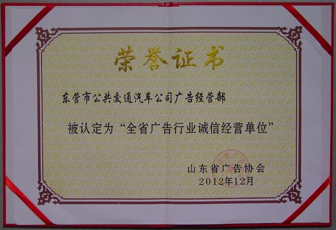近日,市公交公司廣告部獲山東省廣告協(xié)會(huì)頒發(fā)的2012年度“全省廣告行業(yè)誠(chéng)信經(jīng)營(yíng)單位”證書,成為我市獲此殊榮的四家單位之一。