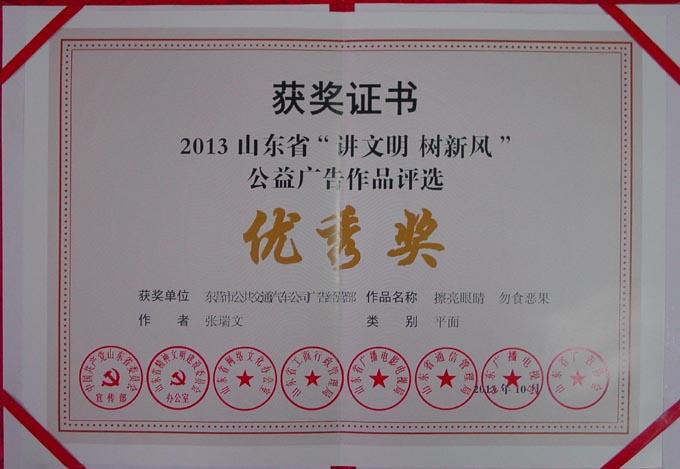 在剛剛揭曉的山東省第十四屆廣告節(jié)“講文明,樹(shù)新風(fēng)”公益類廣告作品評(píng)選中,市公交公司廣告部張瑞文設(shè)計(jì)的反腐倡廉主題作品“擦亮眼睛 勿食惡果”,獲得優(yōu)秀獎(jiǎng),這是繼本界廣告節(jié)“泰山杯”作品評(píng)選獲獎(jiǎng)之后,市公交公司廣告部又一次獲獎(jiǎng)。市公交公司廣告部重視設(shè)計(jì)人員創(chuàng)作水平的提高,通過(guò)多渠道、多方式提高設(shè)計(jì)人員的創(chuàng)作水平,至今,已在省級(jí)評(píng)選中多次獲獎(jiǎng),一批批優(yōu)秀的作品正不斷涌現(xiàn)。