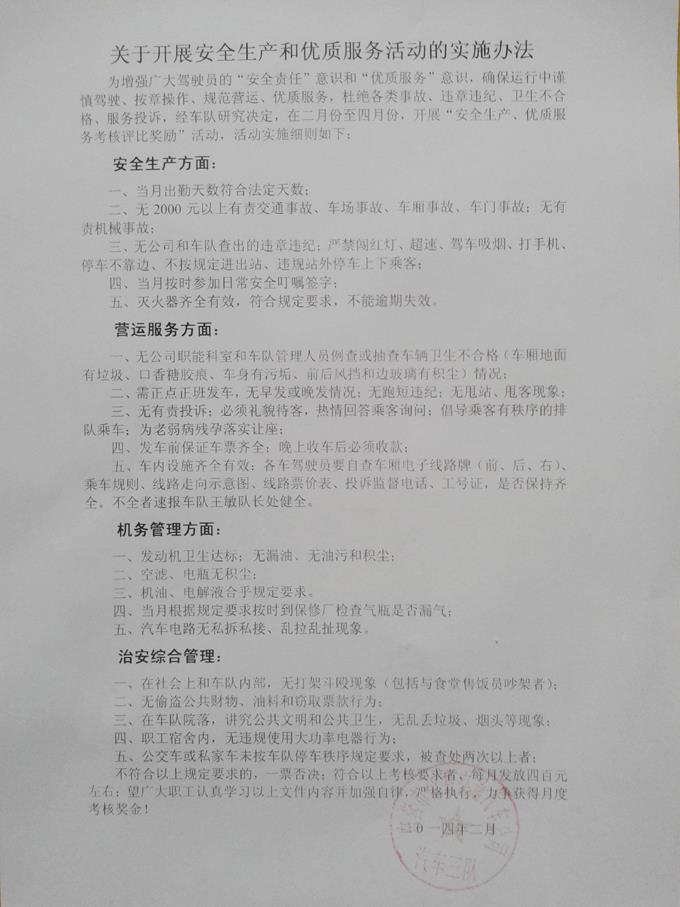 為增強廣大駕駛員的“安全責任”意識和“優(yōu)質服務”意識,促使駕駛員出車前做好車輛檢查和衛(wèi)生保潔,運行中謹慎駕駛、優(yōu)質服務,收車后規(guī)范停車,減少各類違章違紀、服務投訴和行車事故,杜絕單車衛(wèi)生不合格和不收款現(xiàn)象發(fā)生,實現(xiàn)職工薪金跨年度平穩(wěn)過渡,市公交公司汽車三隊充分利用部分工資結余,發(fā)揮經(jīng)濟杠桿作用,自2014年2月份起制定實施了“安全生產(chǎn)和優(yōu)質服務考評獎勵辦法”。