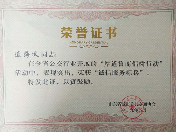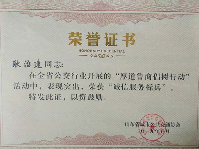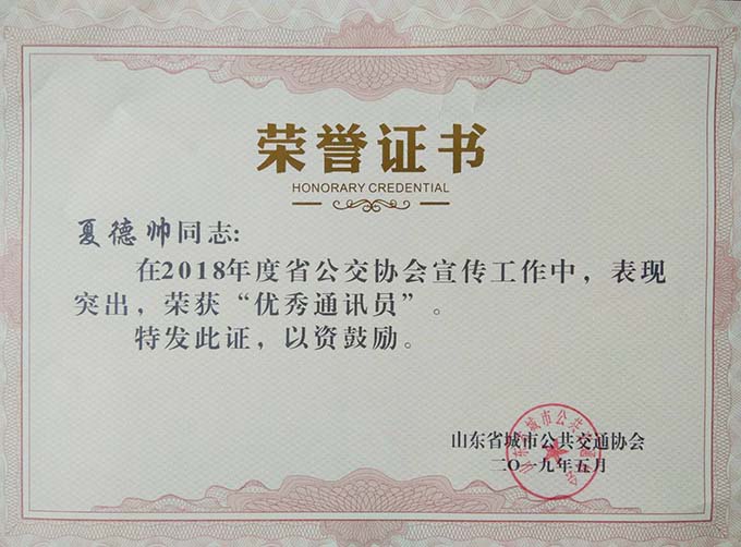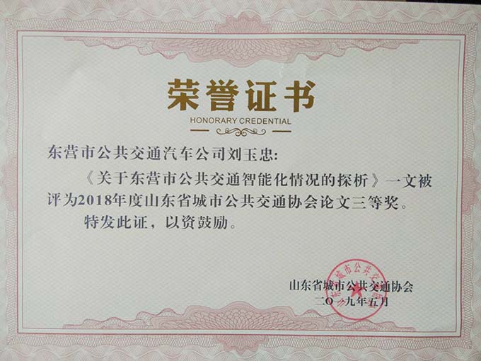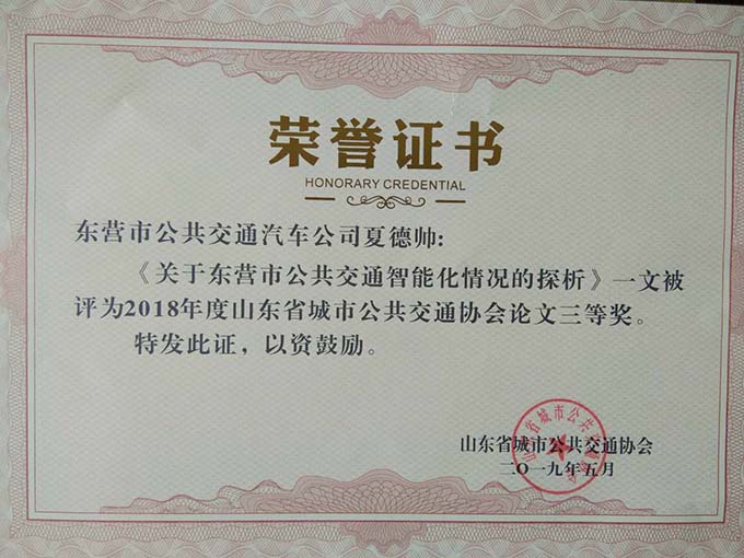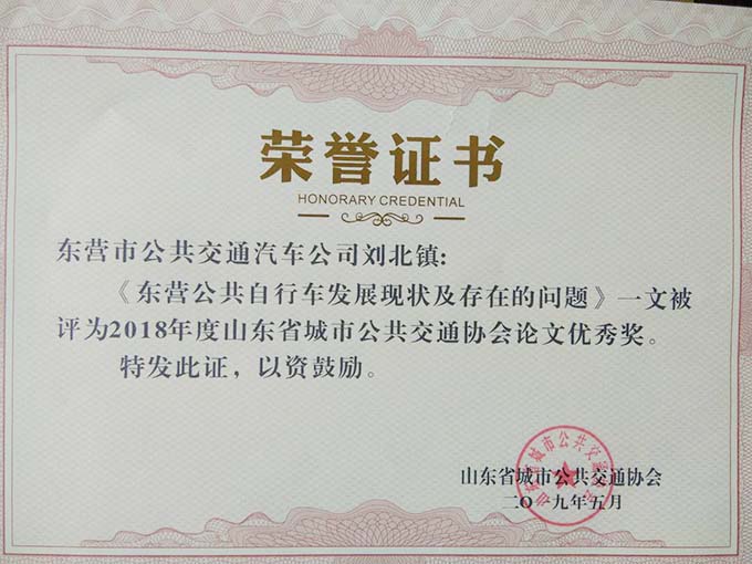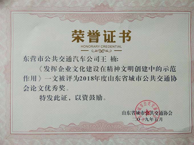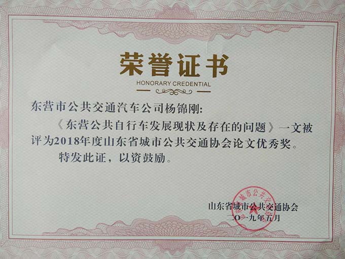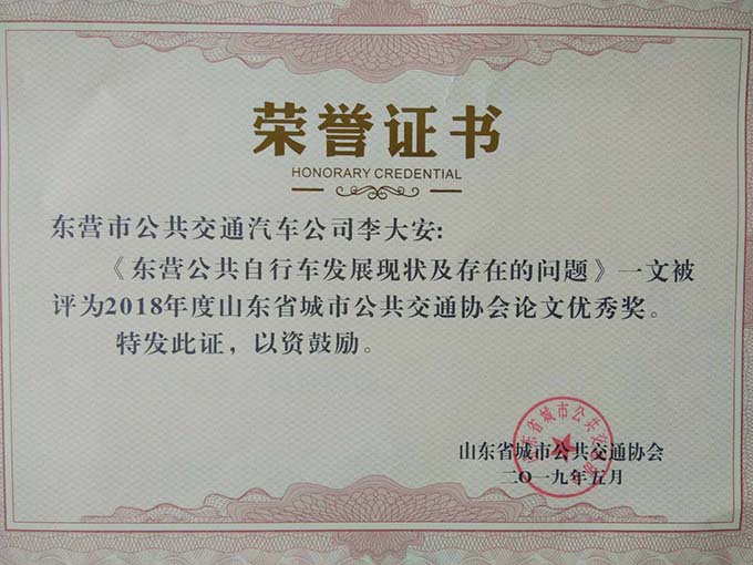 大會(huì)分別表彰了厚道魯商誠信公交企業(yè)、線路、標(biāo)兵及宣傳工作先進(jìn)單位、優(yōu)秀通訊員和優(yōu)秀研究成果論文。公司獲得山東省城市公共交通行業(yè)厚道魯商倡樹行動(dòng)“誠信經(jīng)營企業(yè)”和山東省城市公共交通行業(yè)宣傳工作“先進(jìn)單位”榮譽(yù)稱號,9路車組獲得 “誠信公交線路”榮譽(yù)稱號,公司王凱、耿治建、連海義等三名同志獲得全省公交行業(yè)“誠信服務(wù)標(biāo)兵”榮譽(yù)稱號,夏德帥同志獲得全省公共交通行業(yè)“優(yōu)秀通訊員”榮譽(yù)稱號。由公司選送的《關(guān)于東營市公共交通智能化情況的探析》《發(fā)揮企業(yè)文化建設(shè)在精神文明創(chuàng)建中的示范作用》《東營公共自行車發(fā)展現(xiàn)狀及存在的問題》等3篇論文分別獲得三等獎(jiǎng)1項(xiàng),優(yōu)秀獎(jiǎng)2項(xiàng),并成功入選全省城市公共交通行業(yè)優(yōu)秀論文集。