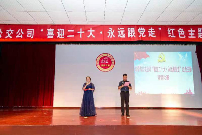 為迎接黨的二十大勝利召開,更加深入學習貫徹省十二次黨代會精神,集中展現(xiàn)新時期公交干部職工在各自工作崗位上的新作為、新?lián)敗⑿伦藨B(tài),引導公司干部職工更加堅定理想信念,在“七一”建黨節(jié)來臨之際,市公交公司于6月30日上午組織開展了“喜迎二十大·永遠跟黨走”紅色主題誦讀比賽活動。市交通運輸局直屬機關黨委專職副書記趙秀來同志到場指導,市公交公司黨委委員、工會主席蔣積堯,黨委委員、辦公室主任劉玉忠等出席活動。