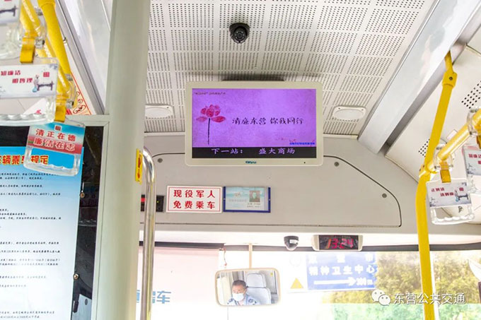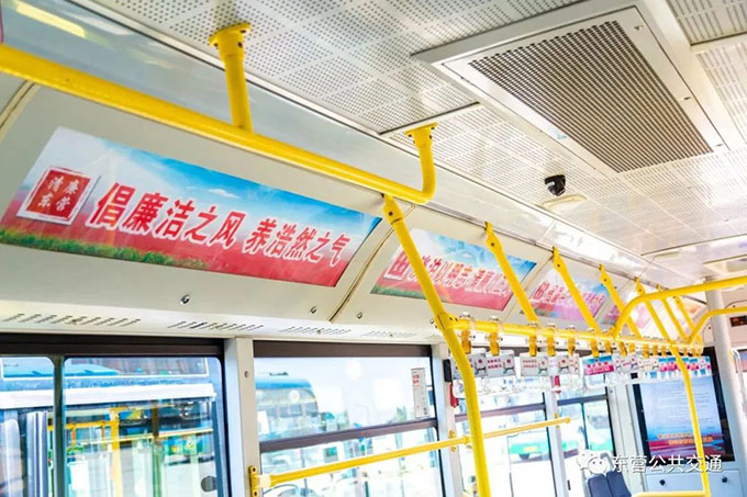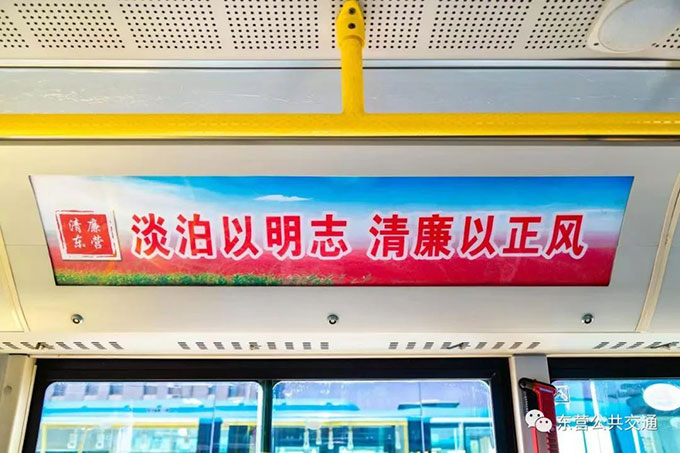 該專線在車體兩側(cè)貼有融入東營本土地域特色的廉潔文化廣告,車廂內(nèi)燈箱、拉手環(huán)等部位,設(shè)計植入了廉潔名言警句等廉潔元素,公交車車載電視媒體平臺循環(huán)播放廉潔文化微視頻、微電影以及動漫視頻,讓市民充分感受“進車有廉、抬頭見廉”廉潔文化氛圍,在乘車中感受廉潔文化熏陶,自覺將思廉、崇廉、尚廉意識轉(zhuǎn)化為守廉、踐廉行動。