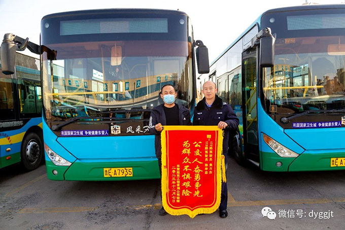 2023年12月8日,東營旭東工程公司的代表來到東營公交集團(tuán)汽車七隊(duì)贈送一面錦旗,上面寫著“公交人奮勇爭先,為群眾不懼艱險”的字樣。這時大家才知道,原來是兩位公交駕駛員見義勇為幫助他們滅了一輛正在自燃的小貨車。