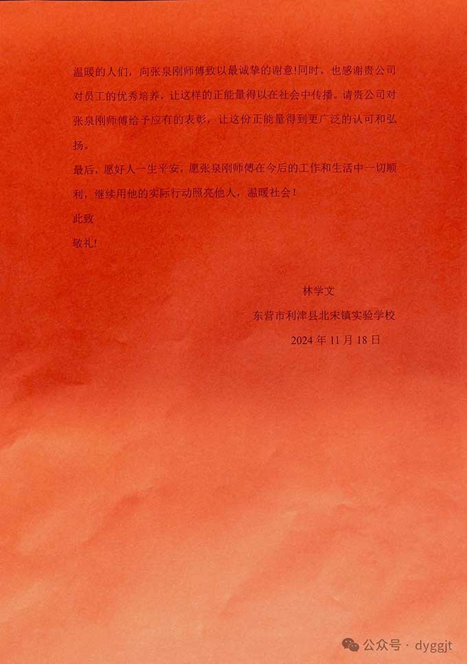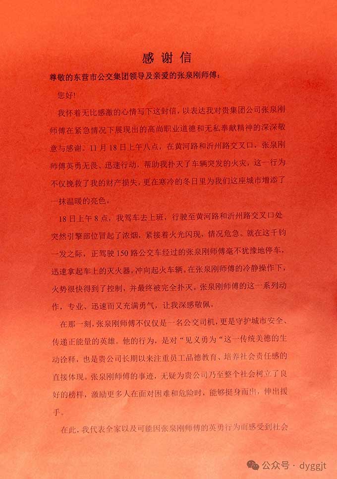 車主林先生特意寫來一封感謝信并制作了一面錦旗表達謝意,字里行間充滿了對張泉剛師傅的感激之情。他在信中提到,張泉剛師傅的行為早已超越了公交駕駛員的基本職責(zé)范疇,堪稱守護城市安全衛(wèi)士和傳遞正能量的楷模一點也不為過。他用實際行動生動詮釋了“見義勇為”這一中華民族的傳統(tǒng)美德,同時也彰顯了東營市公交集團在職工品德教育方面的卓越成效,以及對培養(yǎng)職工社會責(zé)任感的高度重視。