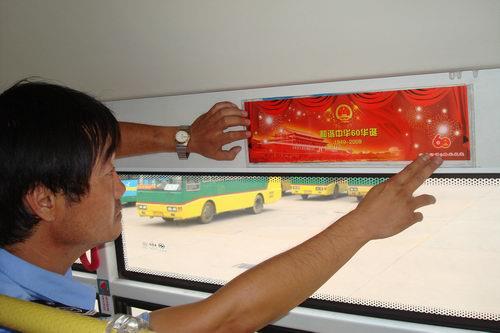 汽車七隊在8路車組車廂內(nèi)張貼國慶宣傳貼