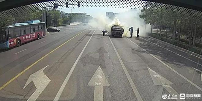 9月10日13點(diǎn)03分,東營(yíng)公交通勤車(chē)隊(duì)駕駛員王維明像往常一樣執(zhí)行124路公交車(chē)運(yùn)營(yíng)任務(wù),當(dāng)他駕車(chē)行駛到沂州路與瀏陽(yáng)河路交叉口紅綠燈時(shí),發(fā)現(xiàn)了異常情況——前方一輛貨車(chē)起火了,王師傅沒(méi)有絲毫畏懼,立即停車(chē)開(kāi)門(mén),提起車(chē)載滅火器沖下了車(chē)。
