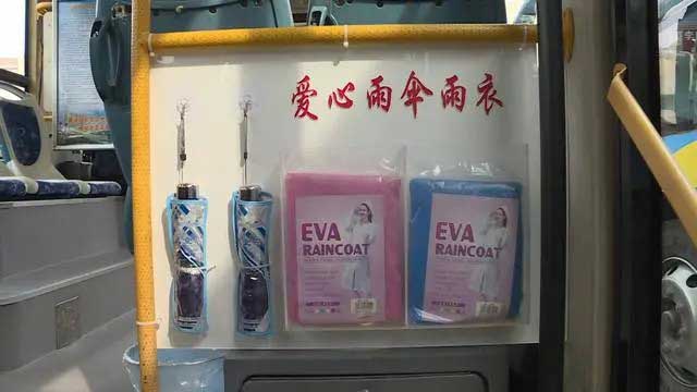 在東營(yíng)市公交公司汽車三隊(duì)停車場(chǎng),駕駛員李斌像往常一樣,把自己駕駛的38路公交車仔仔細(xì)細(xì)打掃了一遍。記者在他的車上,還看到了一些特別的便民物品:前排的礦泉水、藥箱,后排的便民雨傘、雨衣。李斌告訴記者,這些都是他自己購(gòu)置安裝的,就是為了方便乘客。